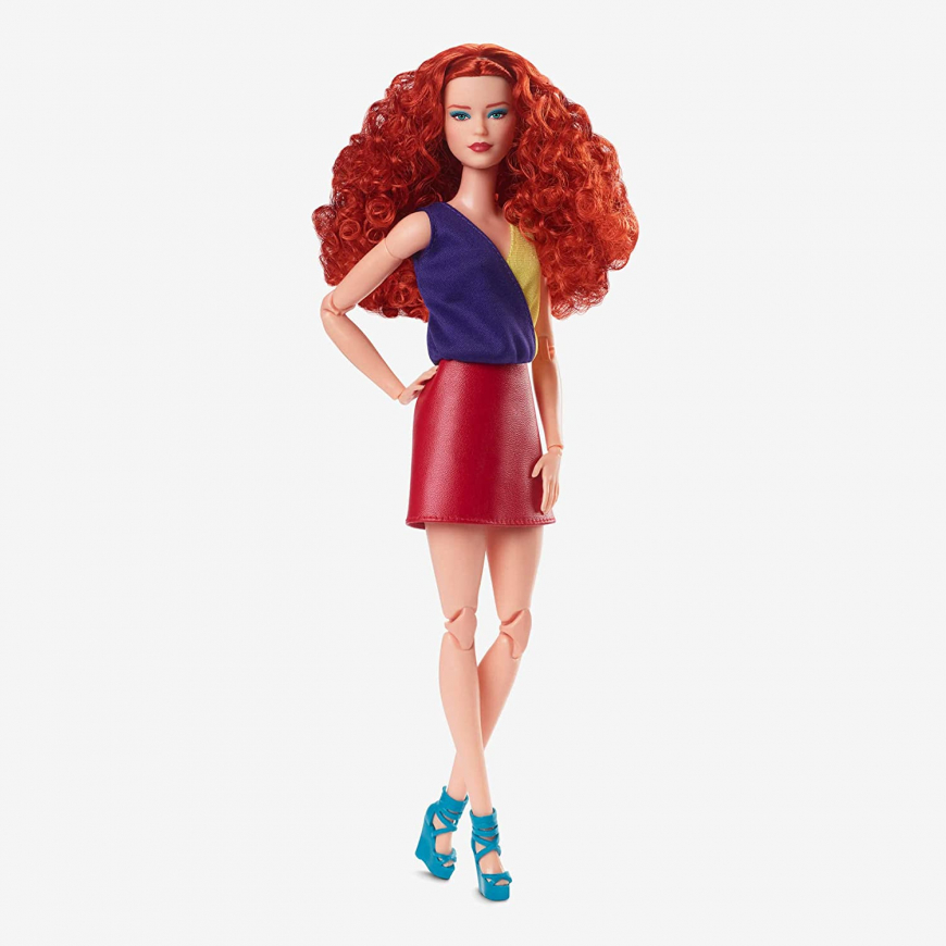 Barbie doll has gorgeous red hair with voluminous curls that tumble over her shoulders. She rocks blue eyeshadow and garnet lips.
