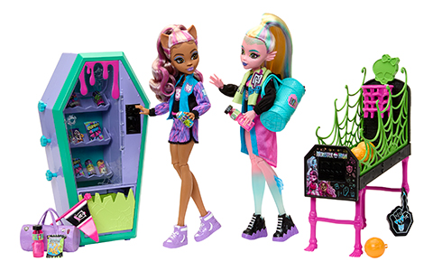 Playset comes with 2 G3 dolls of Lagoona Blue and Clawdeen Wolf (presumably on budget bodies), dressed in sports outfits, vending machine with snacks, game machine with balls, cheerleading accessories and gym bags for the ghouls.