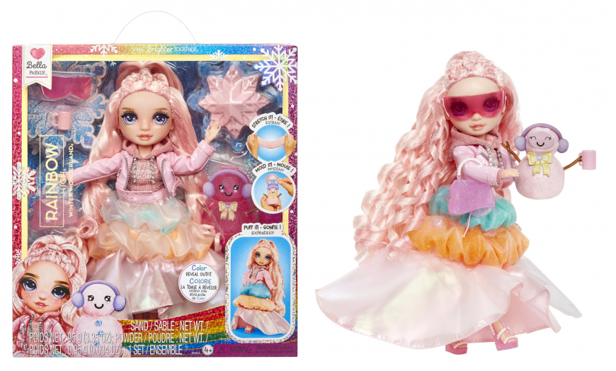 WHAT'S INCLUDED: 11” Fashion doll with complete doll outfit, boots, earmuffs, purse, winter accessory and reuseable Snowman Kit (mold, reusable moldable magical snow (sand) snowman accessory card), 1 dropper (syringe), 1 comb, 1 doll stand.