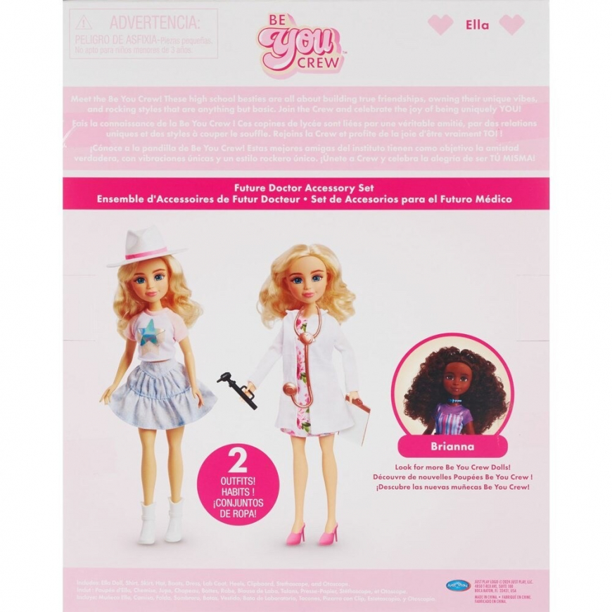 Be bold, be true, be you! Meet the Be You Crew! These high school beauties are all about building true friendships, owning their unique vibes, and rocking styles that are anything but basic. Join the crew and celebrate the joy of being uniquely you! Set includes the Ella doll with blonde hair and blue eyes, t-shirt with holographic star sticker, denim skirt, white mini cowboy boots, and cowboy hat; plus a doctor’s outfit consisting of a white lab coat, floral print dress, pink heels,stethoscope, otoscope, and clip board. She is really cute! The clothes are well made- lab coat and dress are separate pieces, T-shirt is 2 different color fabrics sewn together, not just printed to look like a t-shirt. I think her hair may be poly, but I’m not sure. The only thing I would have added is a strap under her skirt to hold it in place. But otherwise she is super fun for $20. I think she uses the Naturalistas body with a new head sculpt.
