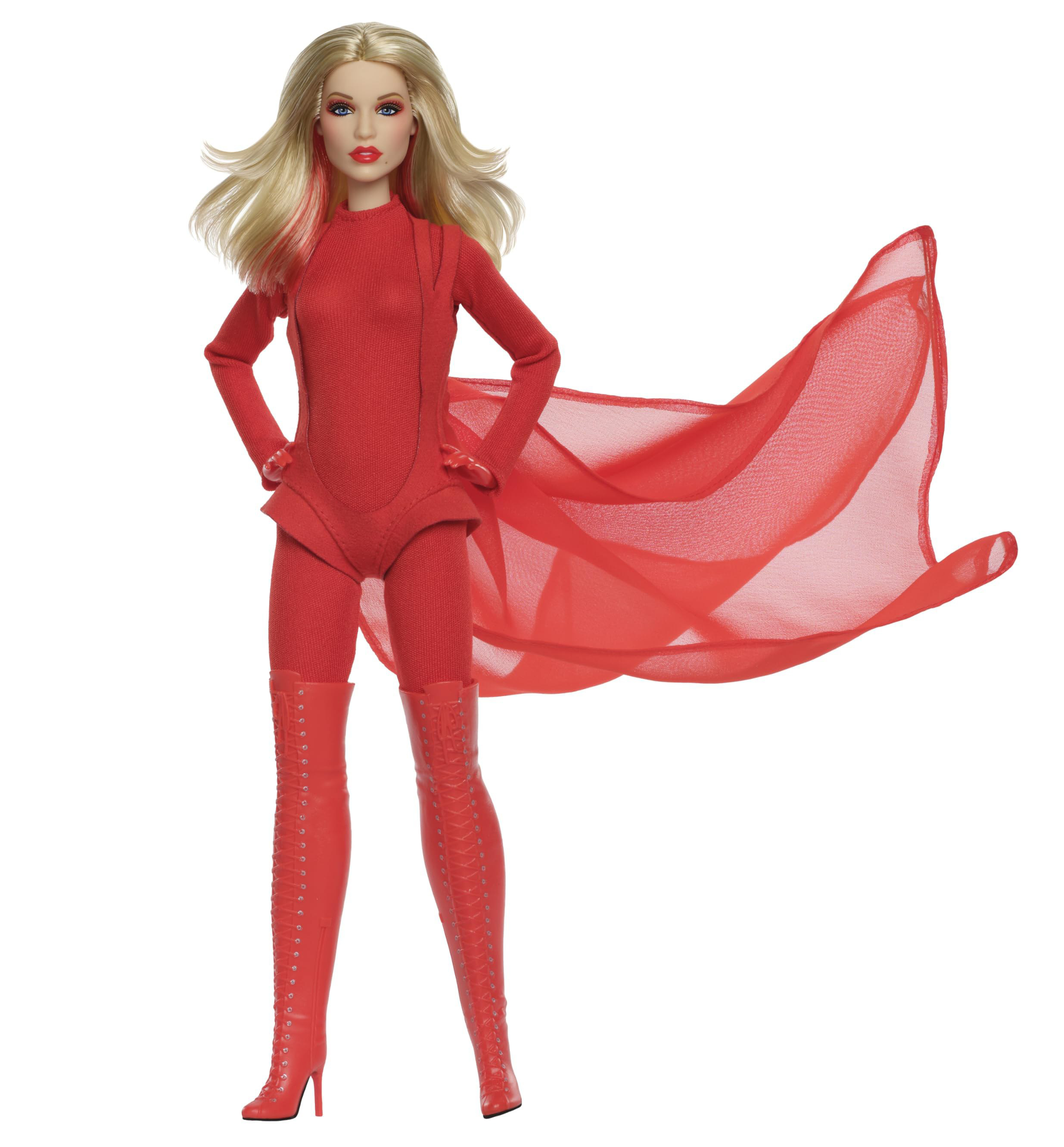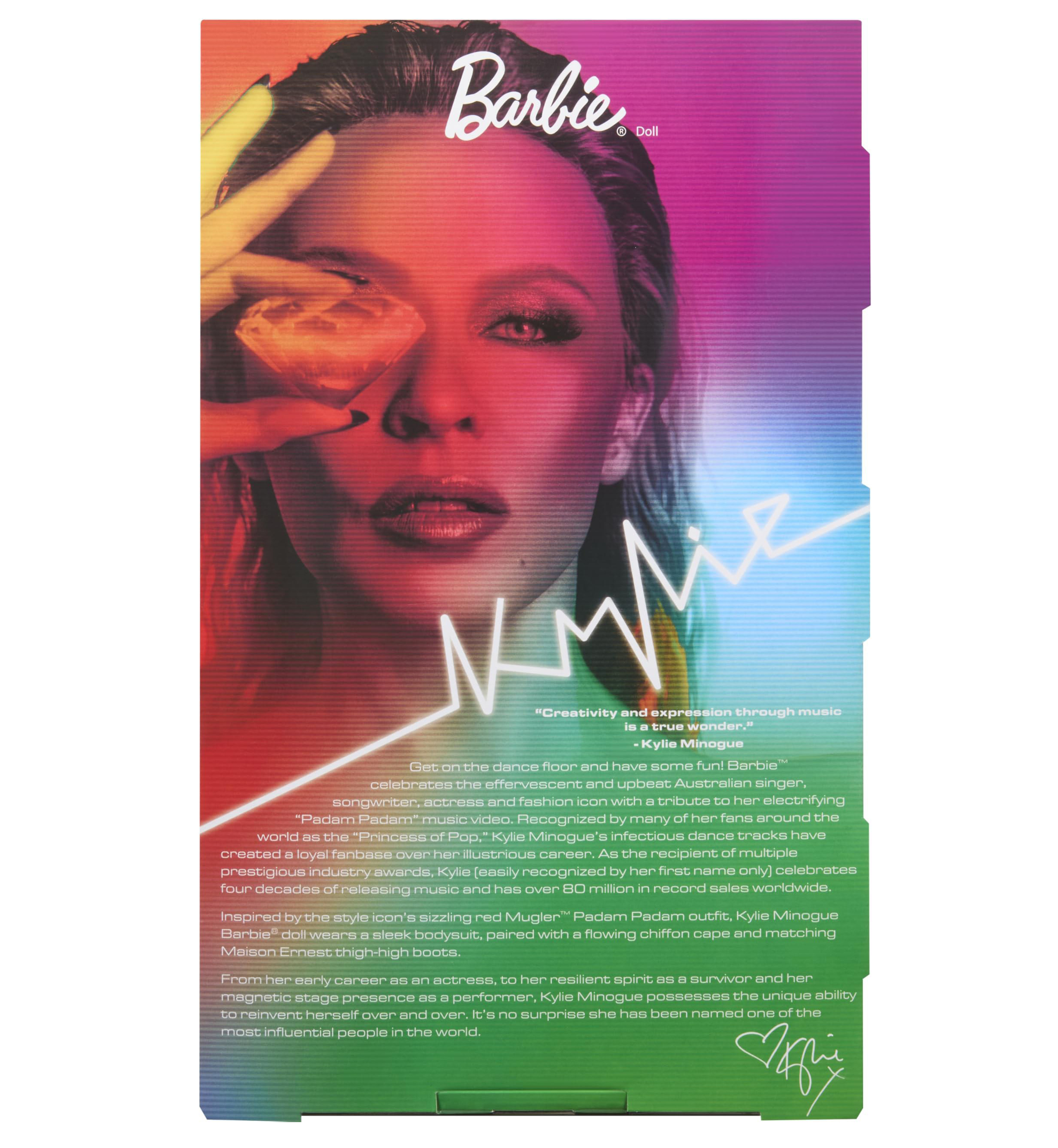A pop icon who has topped the charts for decades and was honored as a Barbie Role Model in 2024 gets a Music Series tribute, perfect for fans and collectors alike. From “Can’t Get You Out of My Head” to “Padam Padam,” Kylie Minogue has been dropping hits since 1987. Our tribute to this Australian award-winner showcases her iconic style, in a look inspired by her “Padam Padam” music video. Rocking red head-to-toe, from her catsuit to her knee-high boots and dramatic cape, she’s ready to strut the stage.