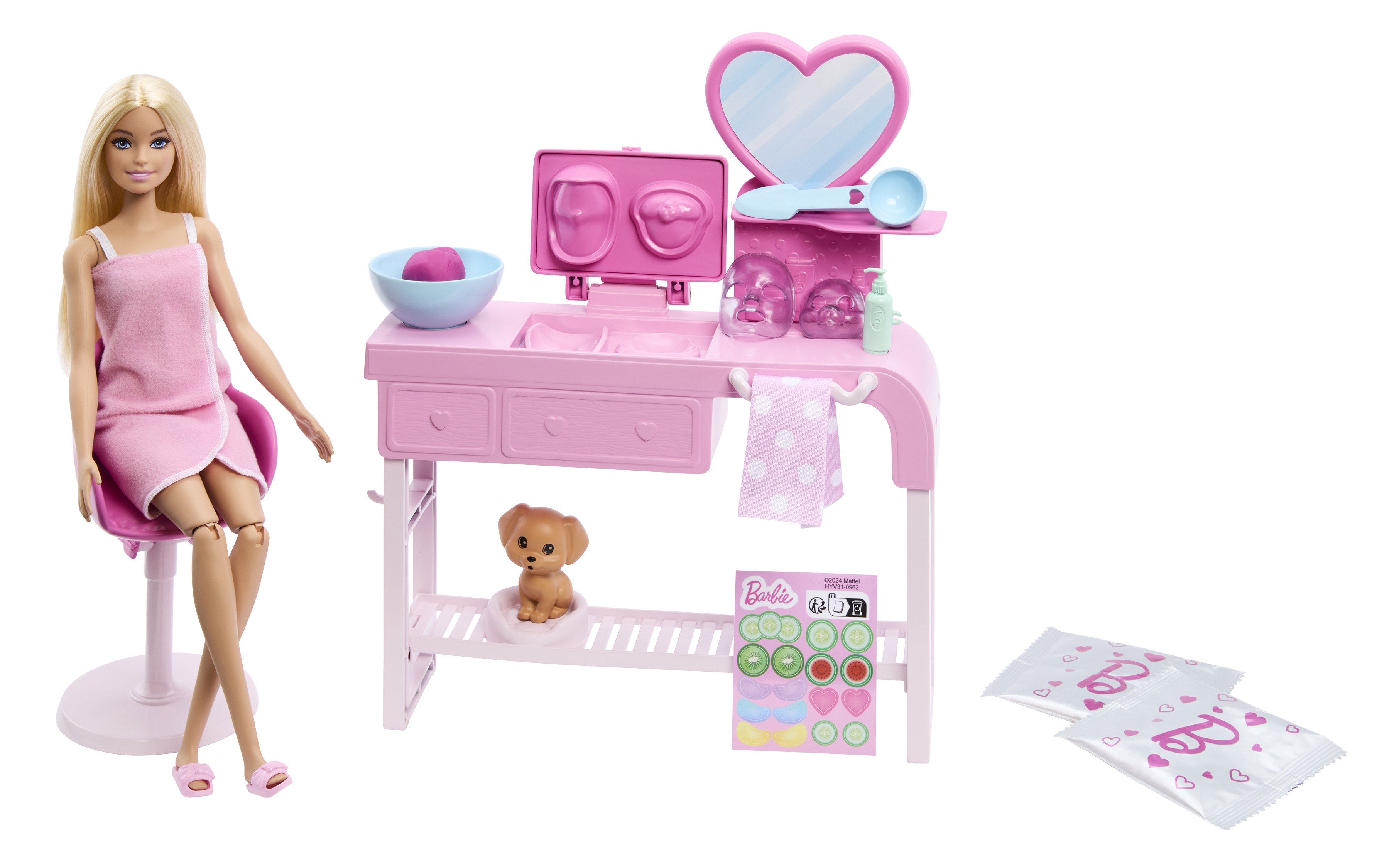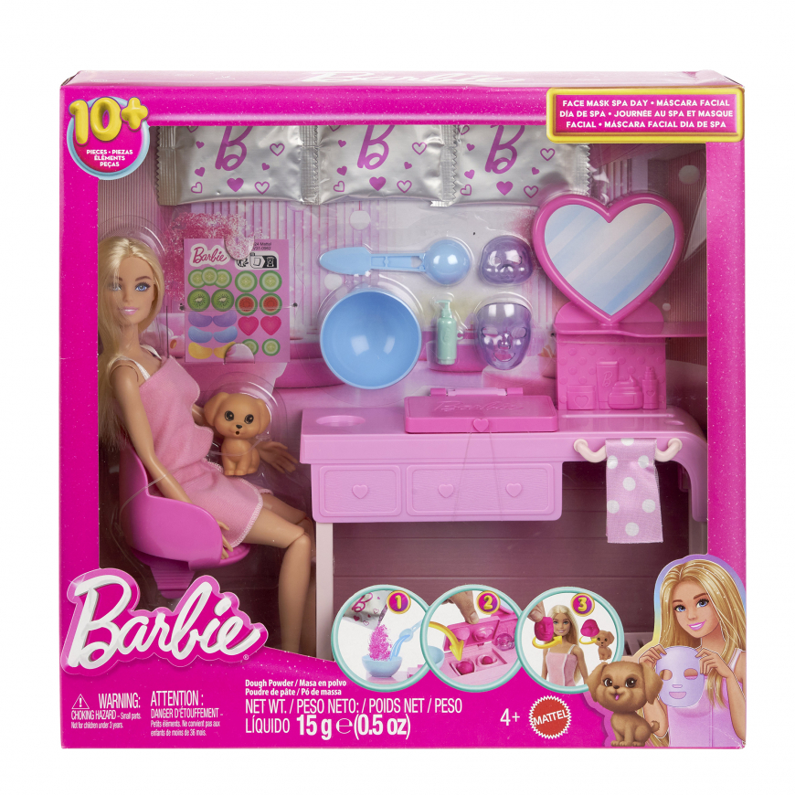 Every day is self-care day with Barbie doll and this 10+ piece Face Mask playset. Kids will love the pink spa station complete with a built-in face mask mold, mirror, and salon chair. To make 'clay' face masks use the bowl and spoon to mix powder with water into dough. Then press the dough with face mask mold and lift up to reveal two masks…one for Barbie, plus another for her pet pup.