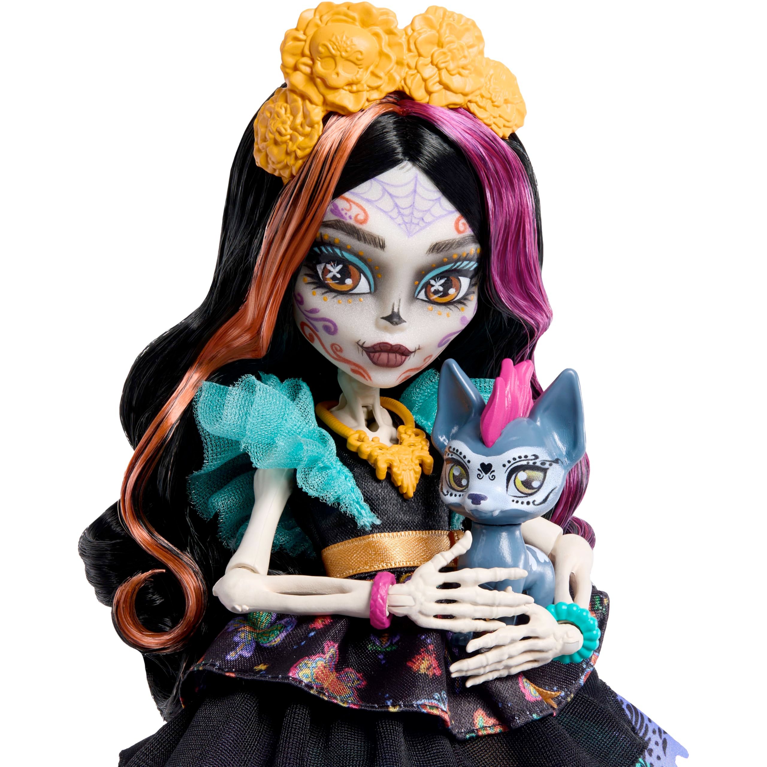 This Monster High doll depicts Skelita Calaveras in her G3 (Generation 3) version. She has a skeleton-style body and long black hair with magenta and copper highlights. Her face is decorated with sugar-skull-inspired Day of the Dead makeup.