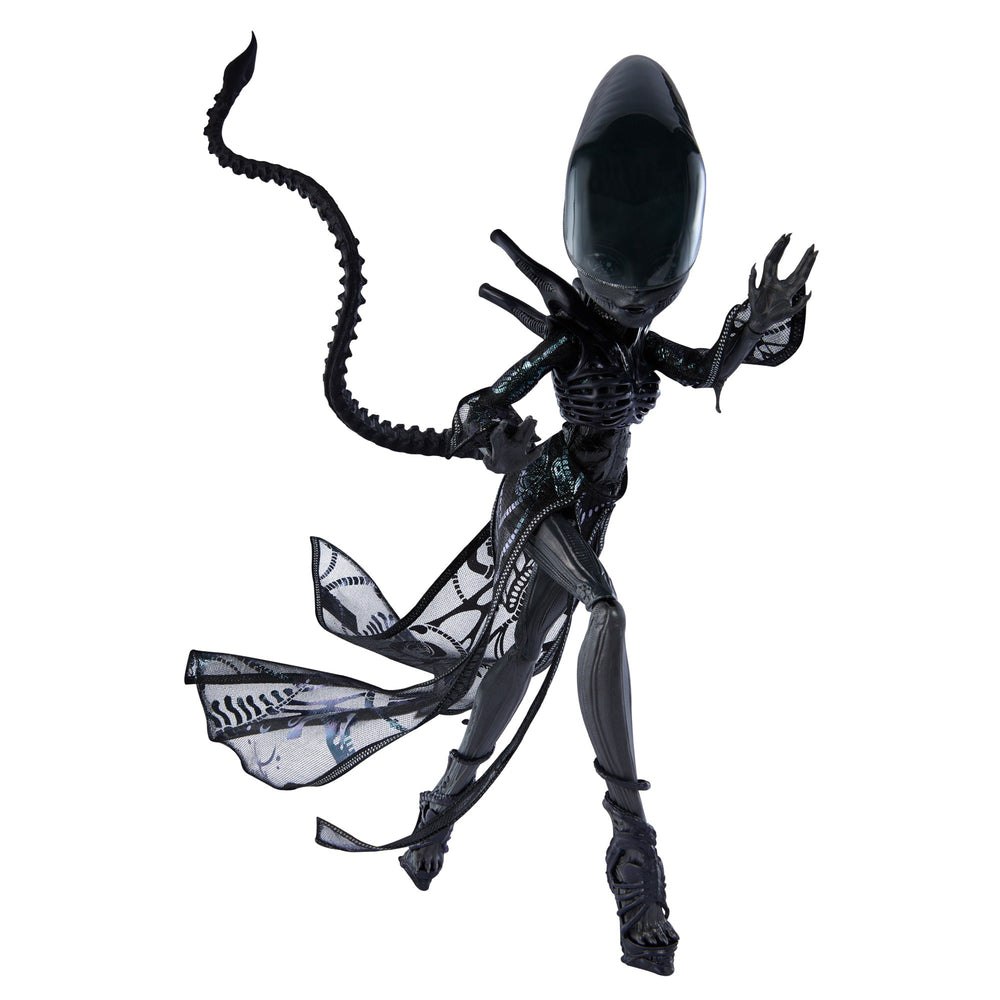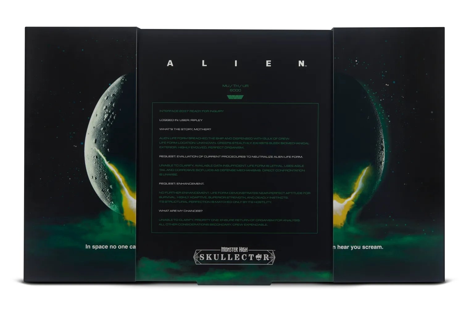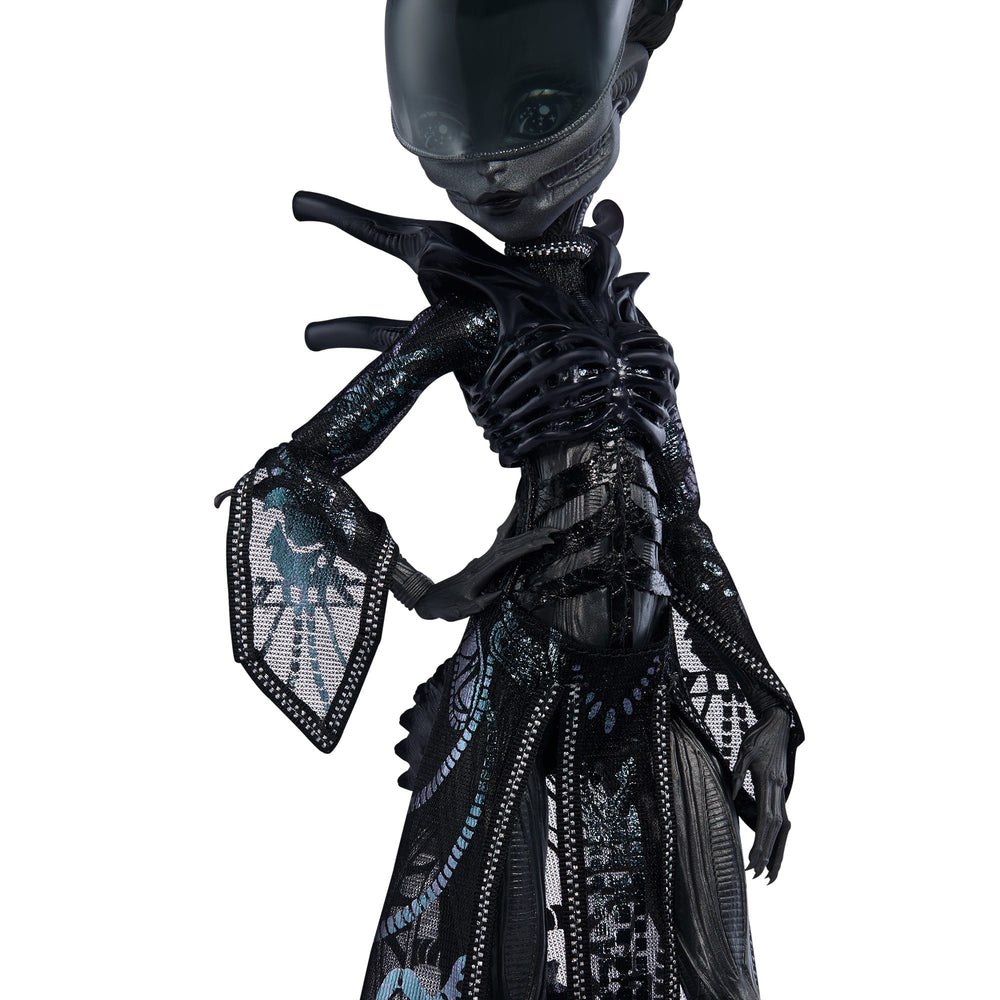 No one can hear you scream in space, especially when the alien hunting you slays this hard. Just in time for scary season and the new Alien: Earth series, we’ve reimagined the iconic Xenomorph of the original film franchise in terrifyingly chic Monster High style. This predatory creature is as nightmarish as ever, dressed in a sheer black and iridescent foil print top and skirt plus a pleather bodysuit. Facehugger heels make the look even more killer.