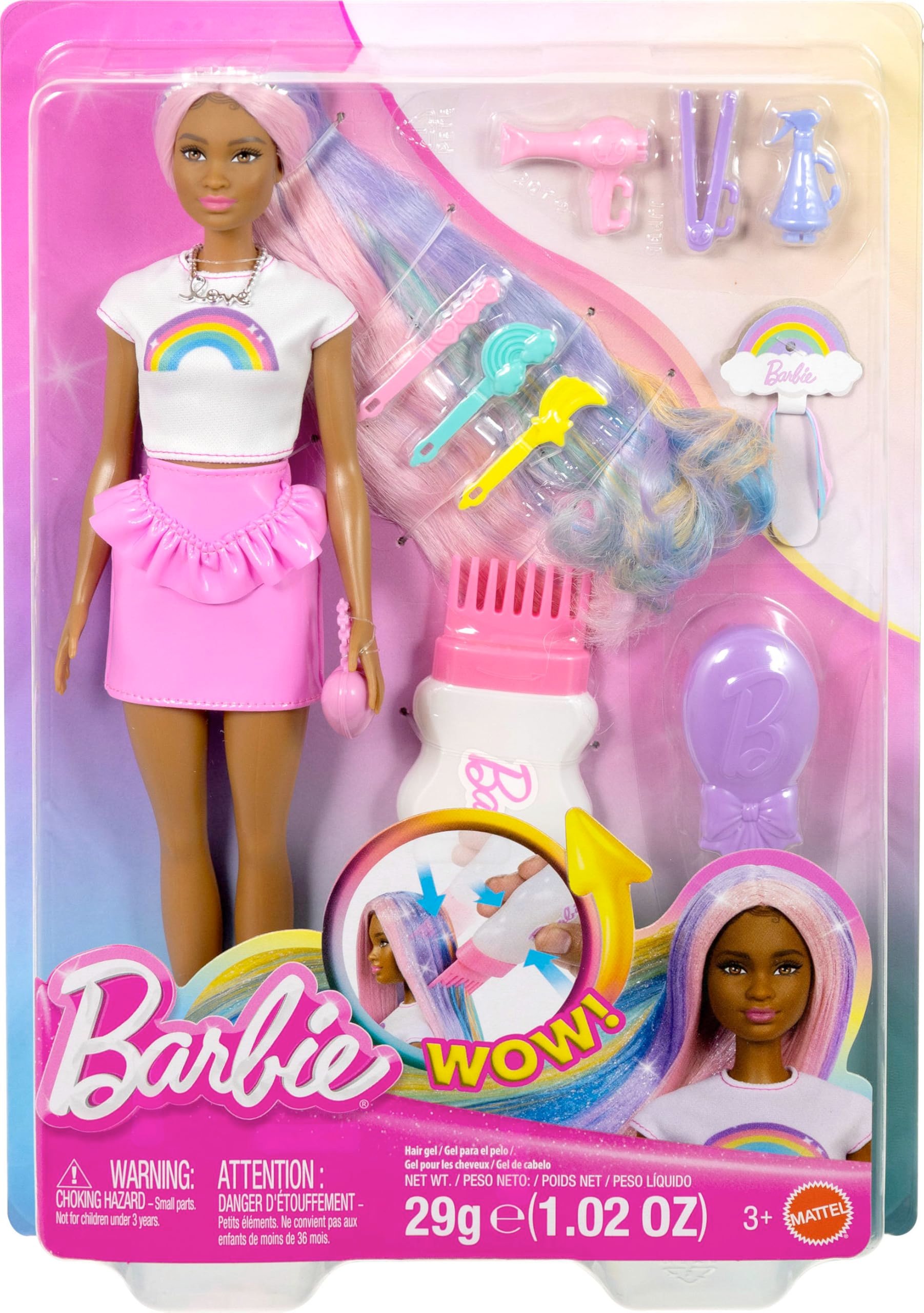 Add sparkle to Barbie doll's hair with the included glitter comb! Squeeze the comb's tube while running it down a lock of hair to glitter-fy it.