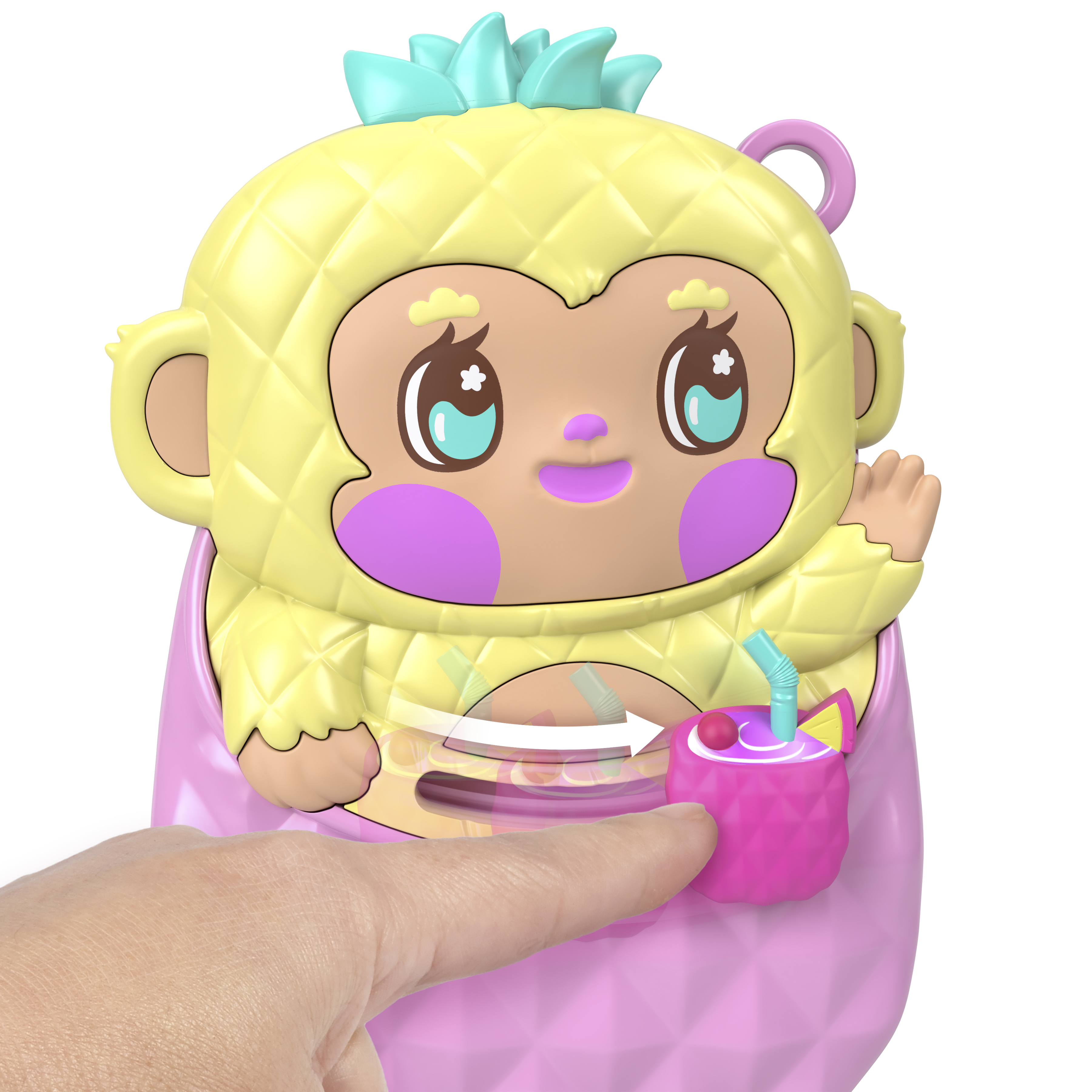 This adorable Polly Pocket core compact features a pineapple monkey-themed exterior and a fun drink slider! Open the playset to discover a tropical adventure! Swing into play with one micro doll and 7 themed accessories, including one pet monkey. Make a splash in the waterfall that lifts! Sway in the pineapple swing or hammock before sipping on a smoothie in the pool there's so much to do! When it's time to run, pack it up for on-the-go fun! Ideal for ages four years old and up, especially those who love tropical adventures.