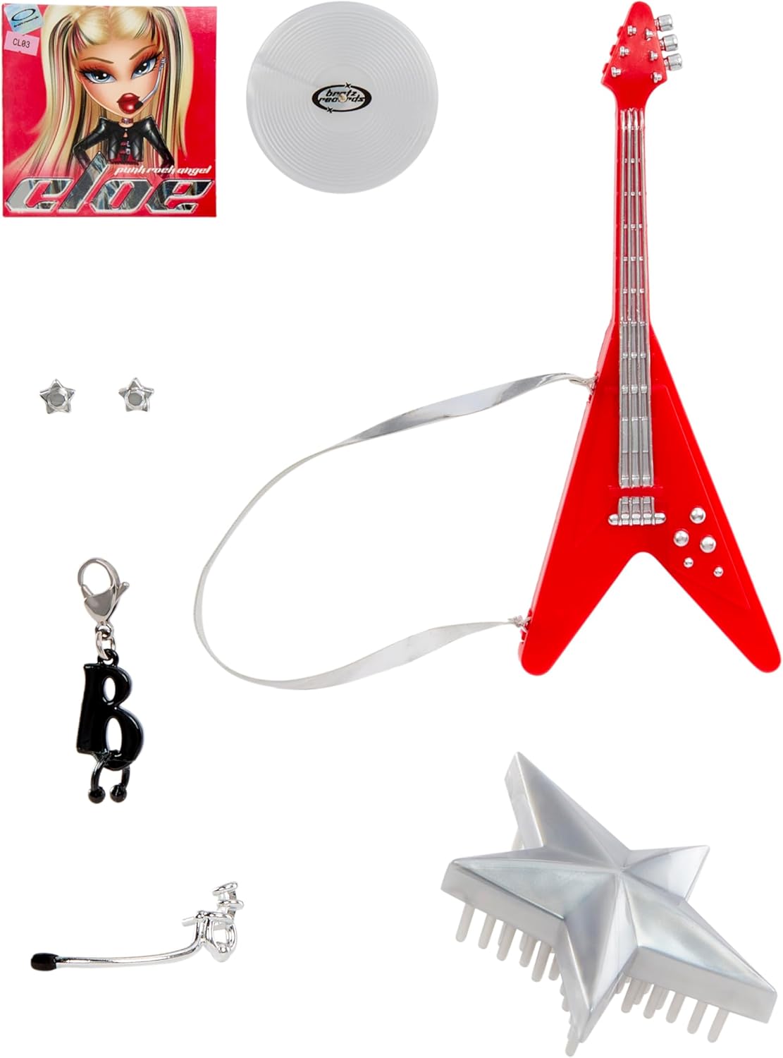 Accessories: Red electric guitar, headset microphone, silver star earrings, silver star brush.