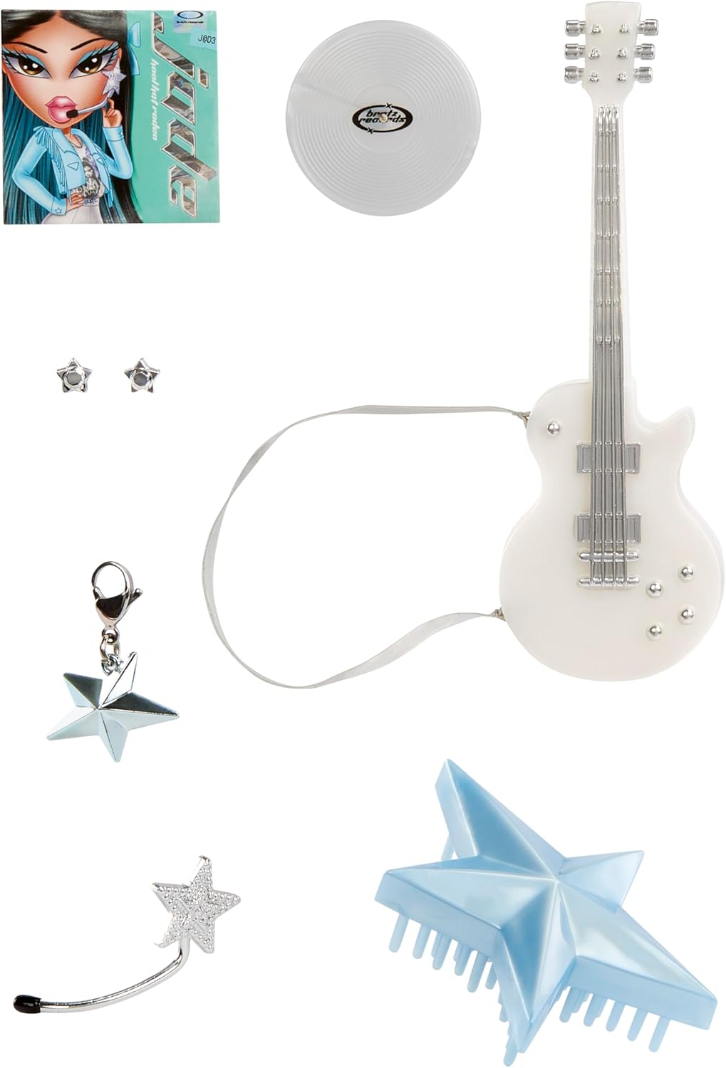Accessories: White electric guitar, headset microphone, silver star earrings, blue star brush.