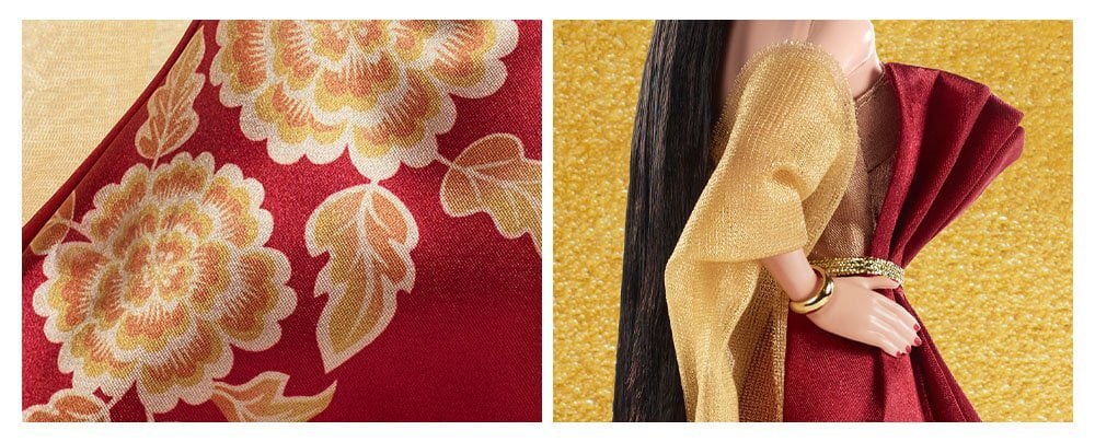 Gold: Represents wealth and well-being. The fabric texture appears to mimic traditional brocade or silk with intricate embroidery, adding a layer of luxury to the doll’s aesthetic.