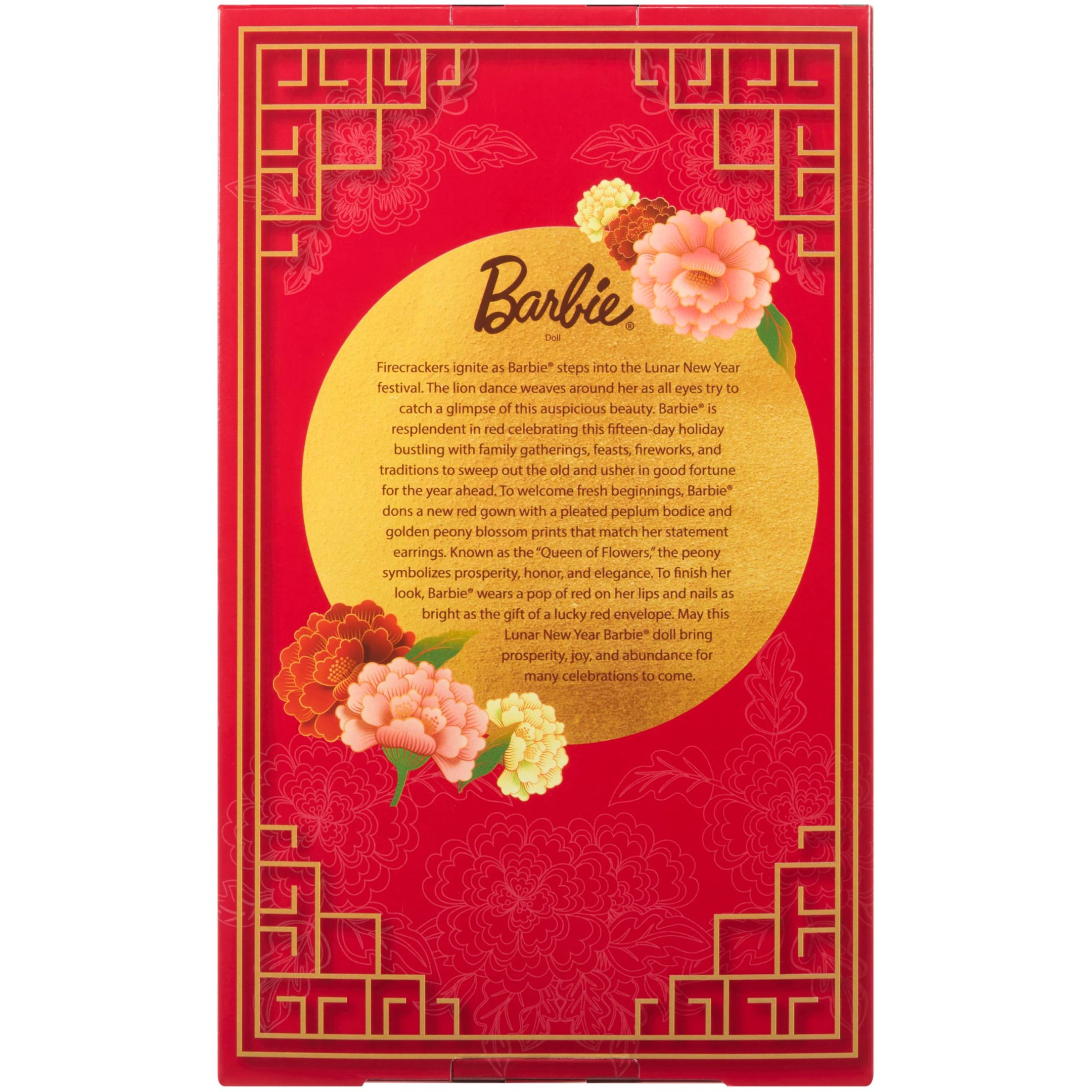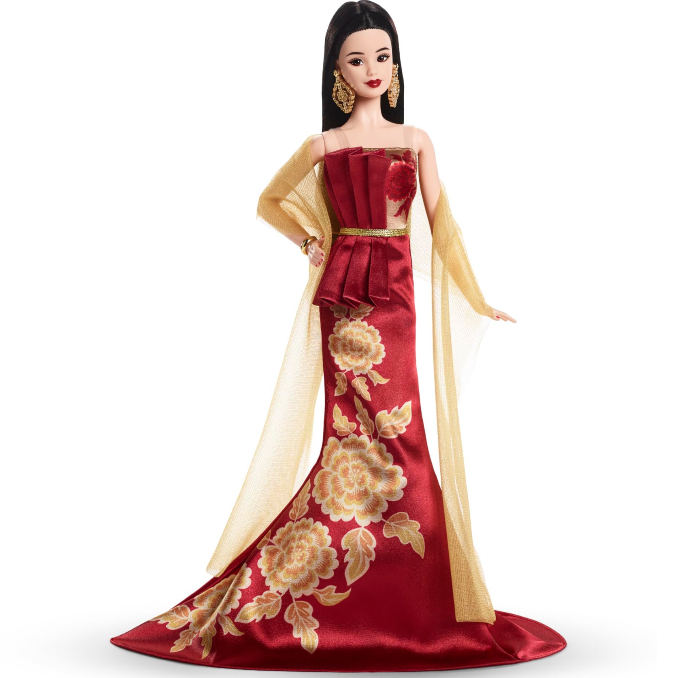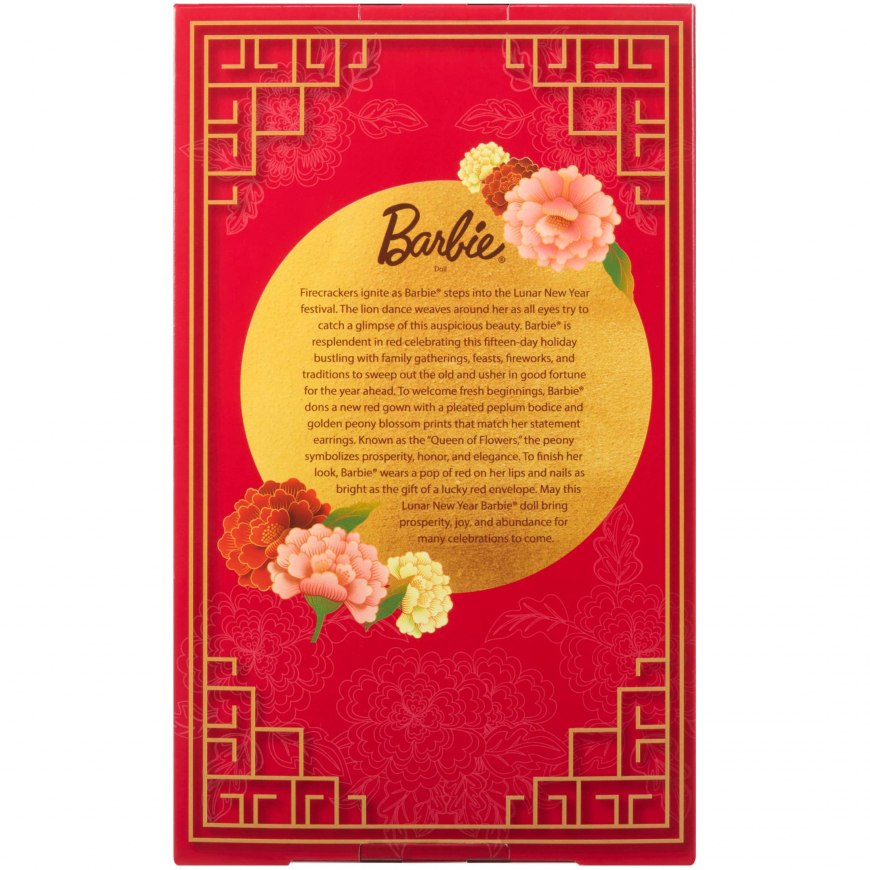 Firecrackers ignite as Barbie® steps into the Lunar New Year festival. The lion dance weaves around her as all eyes try to catch a glimpse of this auspicious beauty. Barbie is resplendent in red celebrating this fifteen-day holiday bustling with family gatherings, feasts, fireworks, and traditions to sweep out the old and usher in good fortune for the year ahead. To welcome fresh beginnings, Barbie dons a new red gown with a pleated peplum bodice and golden peony blossom prints that match her statement earrings. Known as the "Queen of Flowers," the peony symbolizes prosperity, honor, and elegance. To finish her look, Barbie wears a pop of red on her lips and nails as bright as the gift of a lucky red envelope. May this Lunar New Year Barbie doll bring prosperity, joy, and abundance for many celebrations to come.