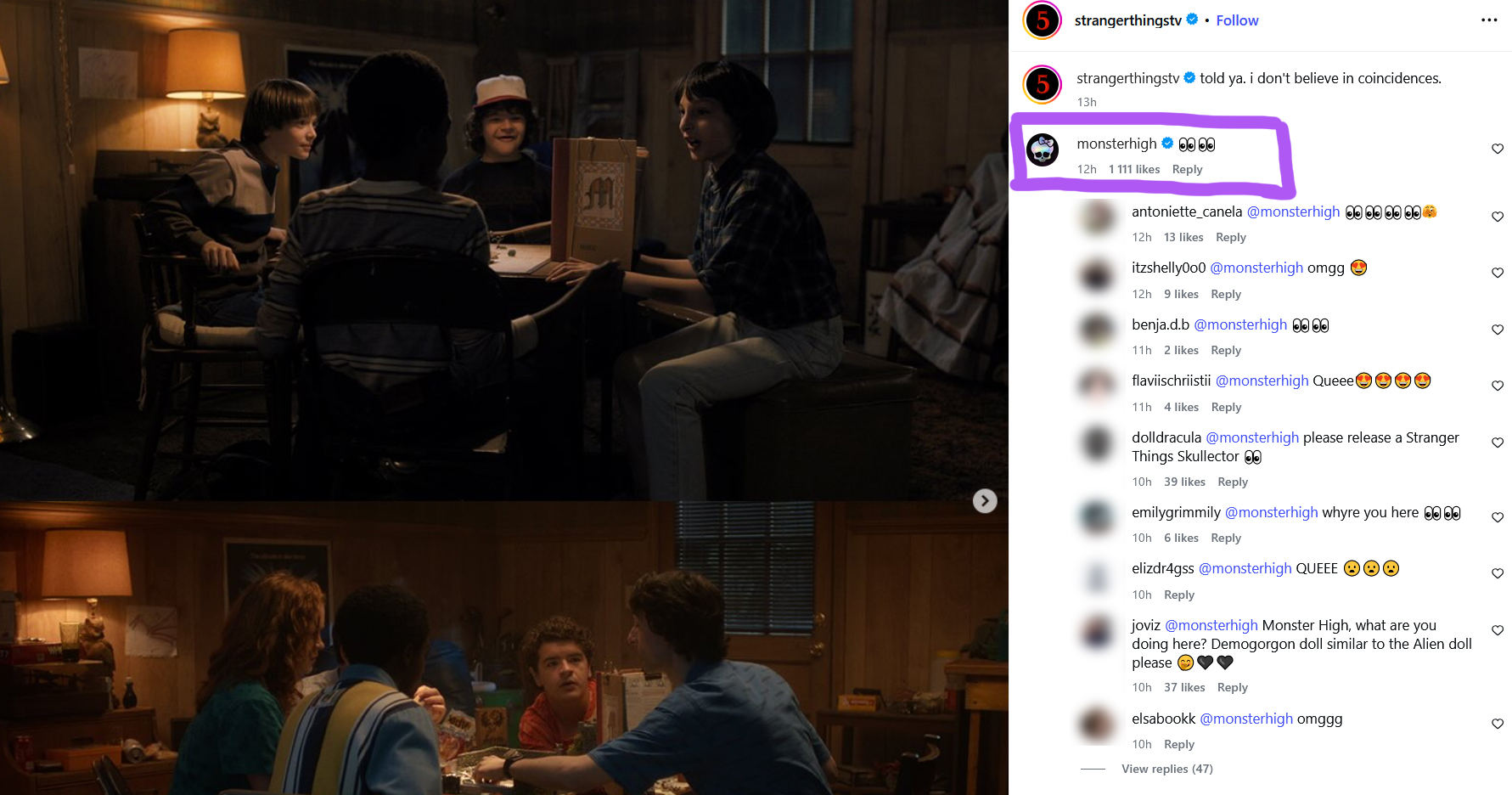 Fans have started speculating about a possible collaboration between Monster High and Stranger Things after the official Monster High account not only liked, but also commented on a recent Stranger Things Instagram post using an emoji often interpreted by fans as a strong hint.