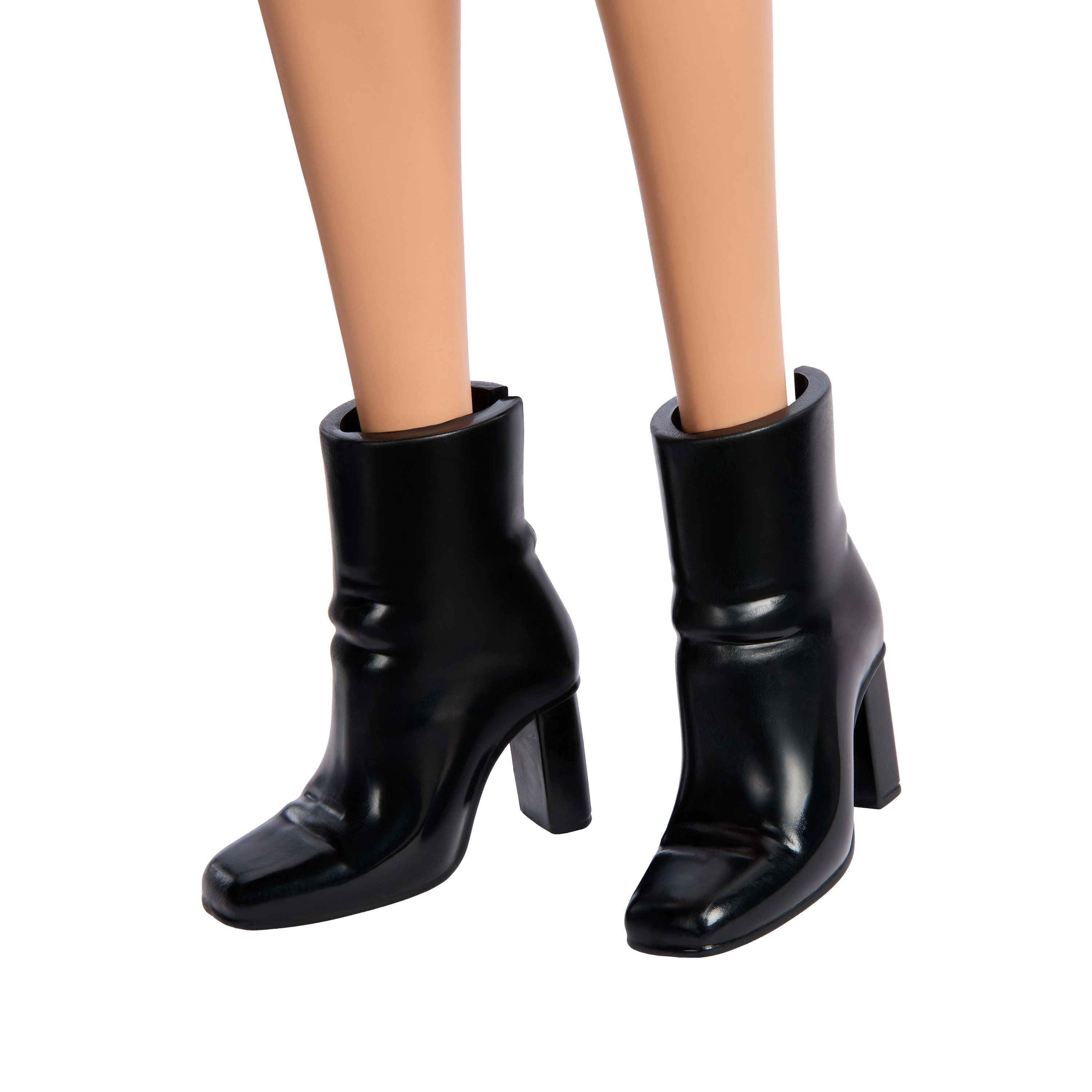 The doll has long blonde hair styled in loose waves and wears black ankle boots with heels. Her makeup includes bright red lipstick and blue eyes.