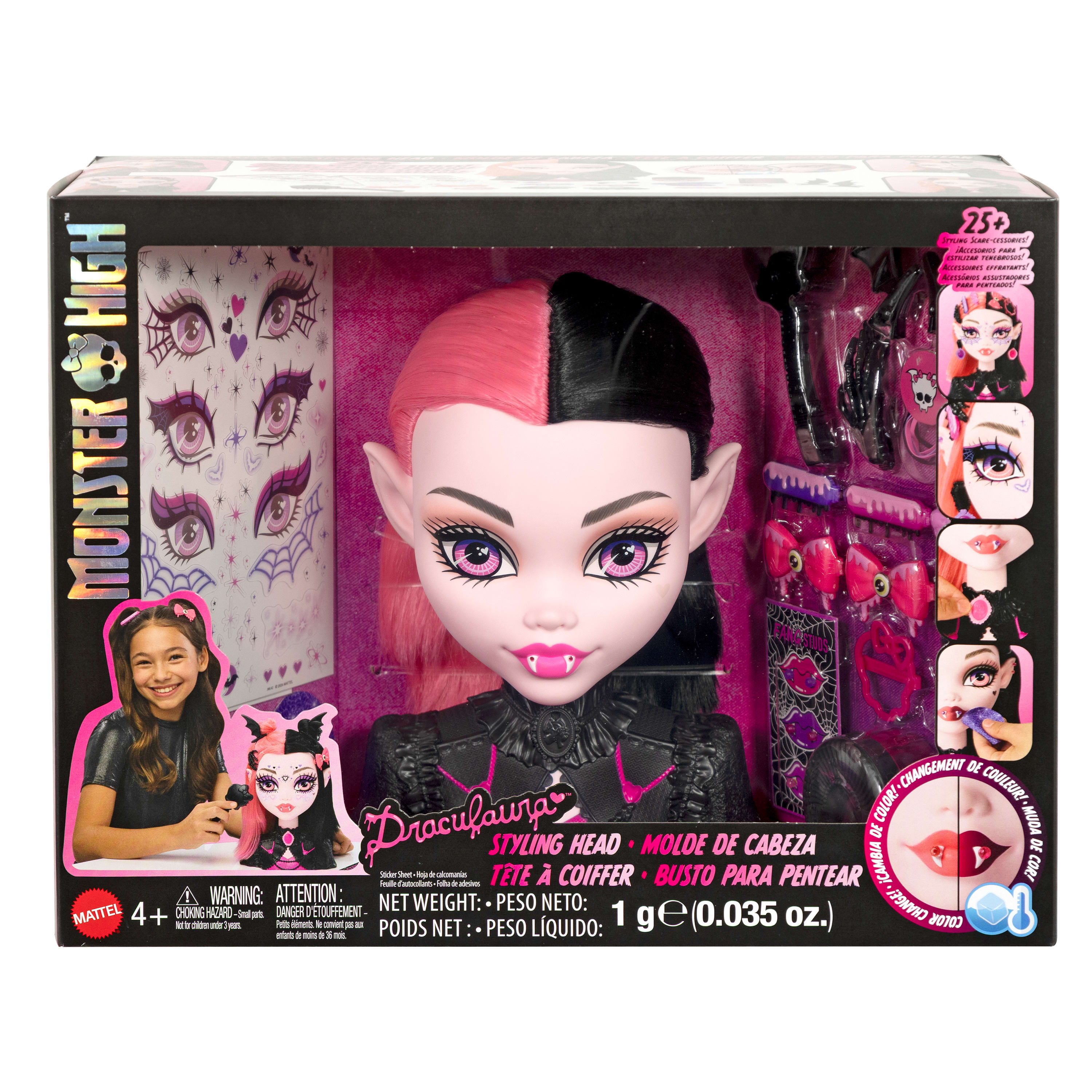 Customize a vampire's look with the Draculaura Styling Head! It comes with 25+ accessories for countless styles and hours of scary-cool hair and makeup play.