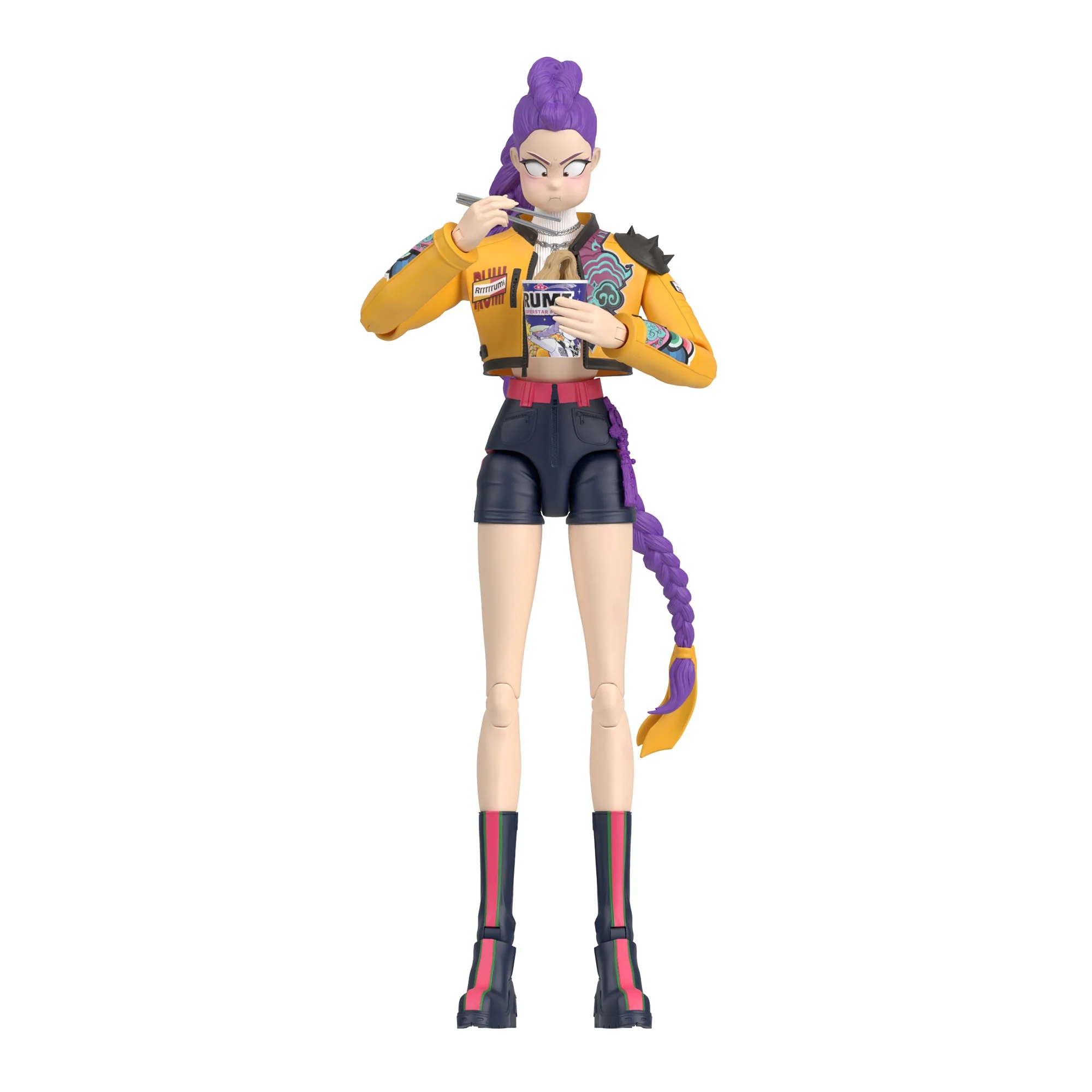 Zoey raps, fights, and sings her heart out in her “How It’s Done performance ‘fit. This action figure features 20 points of articulation and accessories like her formidable Spirit Blades, a ramyeon cup, and bag of shrimp crackers. The Zoey figure comes with interchangeable hands and faces for showstopping play and display.