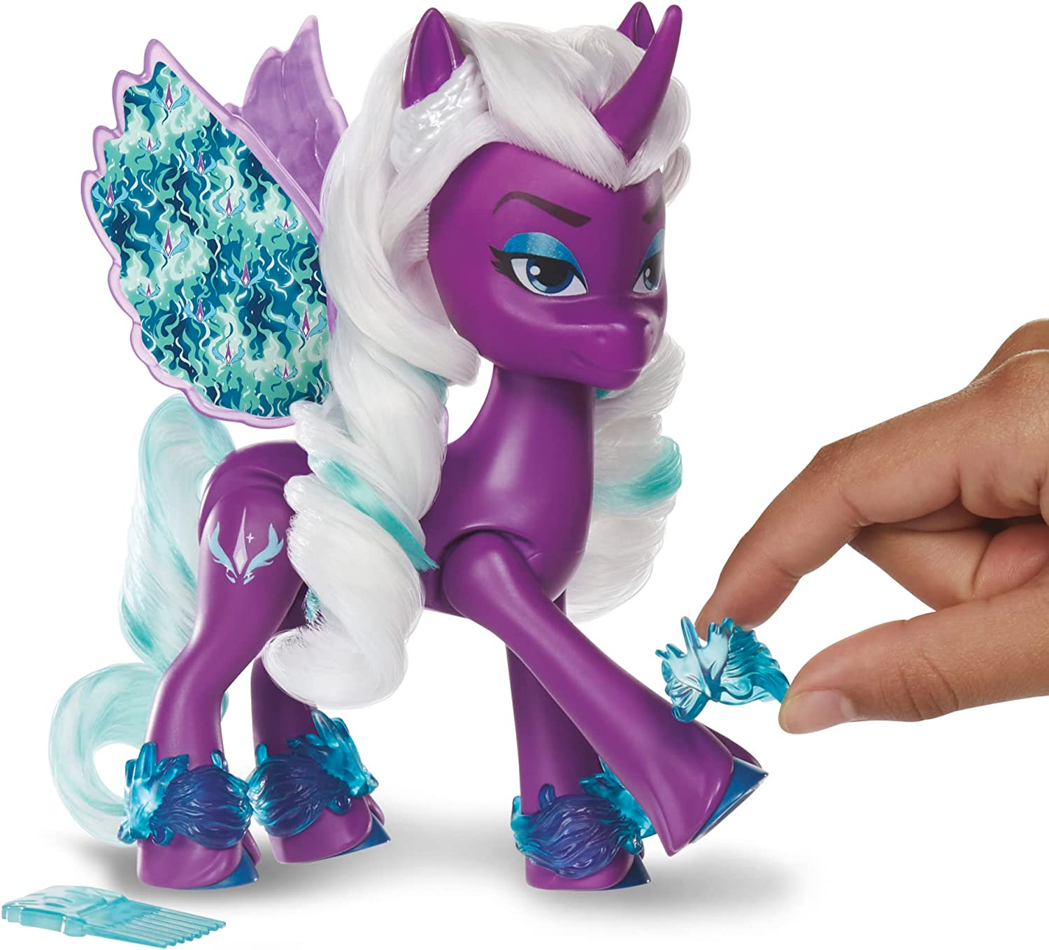 Discover magical secrets with My Little Pony Wing Surprise Opaline Arcana toy! Opaline is a Fire Alicorn villain who tries to steal ponies' Cutie Marks in the My Little Pony: Make Your Mark show. Connect the colorful charms to Opaline's beautiful wings to imagine she's growing her Fire Alicorn magic! Then, squeeze the figure's back legs to make her wings flap up and down. Comes with 10 accessories for styling and storytelling. Customize her look with 4 show-inspired gauntlet bracelets that connect to her legs. This My Little Pony doll is a 5-inch purple Alicorn figure with an Alicorn Cutie Mark on one side. Figure has soft, long white hair and a comb for styling fun.