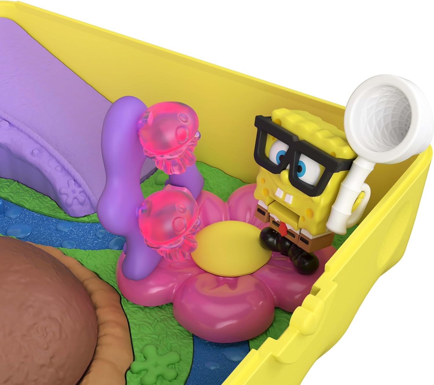Inside, fans will find SpongeBob’s iconic pineapple house, Squidward’s Easter Island-style home, and Patrick’s cozy rock, all recreated in charming Polly Pocket scale. The set includes tiny figures of SpongeBob, Patrick, and Gary, along with fun accessories like jellyfish, a treasure chest, and SpongeBob’s glasses and net — perfect for imaginative adventures.