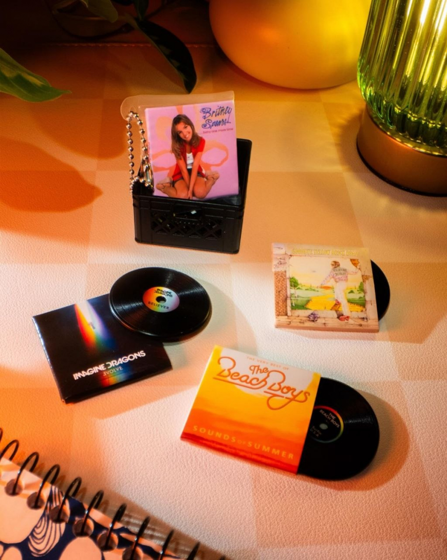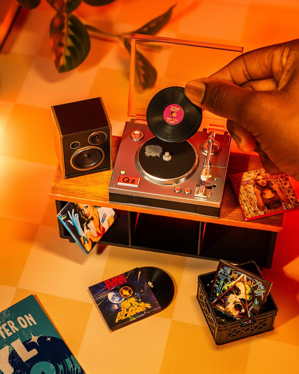 It includes mini vinyl records of Blink-182, Britney Spears, Public Enemy, The Beach Boys, Def Leppard, Amy Winehouse, Imagine Dragons, Elton John, and Bob Marley. And you can display, wear, and actually play miniature turntable from Miniverse Real Music.