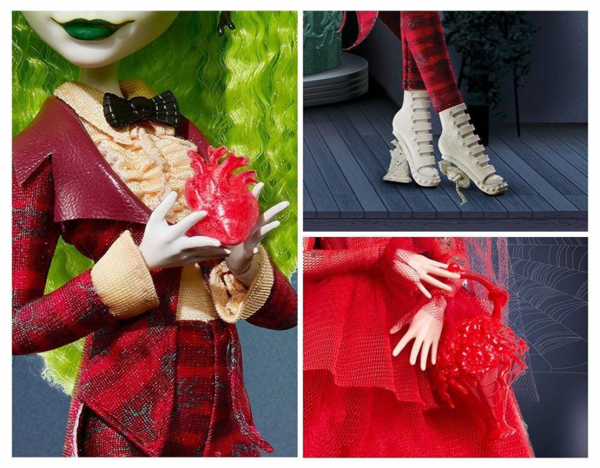 Who says romance is dead? Beetlejuice holds her heart in her hand in the ultimate gesture of affection, while Lydia carries a bouquet of flowers that doubles as a handbag. With terrifically plush packaging and two doll stands for display, this Beetlejuice x Monster High Skullector 2-pack is spookily memora-ble. Includes one Beetlejuice doll, one Lydia doll, two accessories, two doll stands and a Certificate of Authenticity. Dolls cannot stand alone. Colors and decorations may vary.